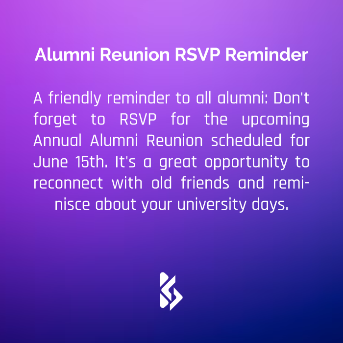A friendly reminder to all alumni: Don't forget to RSVP for the upcoming Annual Alumni Reunion scheduled for June 15th. It's a great opportunity to reconnect with old friends and reminisce about your university days.